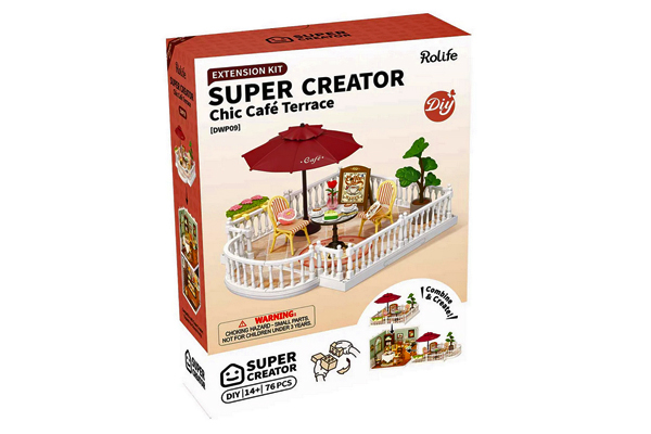 The Super Creator Chic Café is designed to stand on its own as a unique terrace or become a rooftop terrace on top of other Super Creator rooms. Create a cute café corner or snap it on top of a room for a cozy balcony. Whether you want a sunny spot to relax or a stylish space to hang out, this extension kit helps you build the lifestyle you love in miniature.