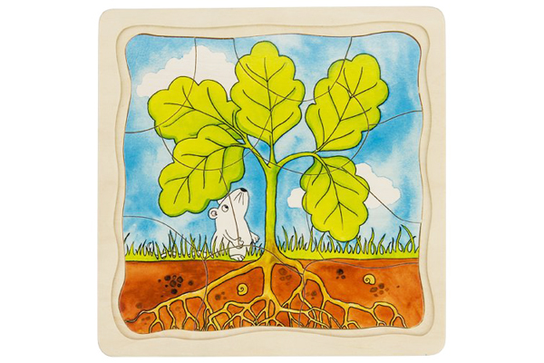 Where exactly do trees come from? This 4-layer puzzle is a wonderful step-by-step story of how an oak tree grows from a tiny acorn to a huge tree. Children are delighted to solve this “growing” mystery from the bottom layer up!