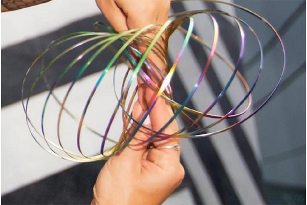 These kinetic, interactive sculptures roll up and down your arms with a feather-light touch. But they’re not really rings at all. Each MOZI is actually a single, long piece of very thin metal, curved into interconnected spirals.
