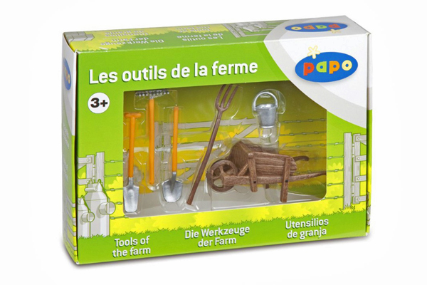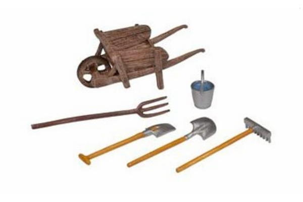 PAPO’s Wheelbarrow comes with 2 shovels, a rake, a pitchfork and a bucket.
